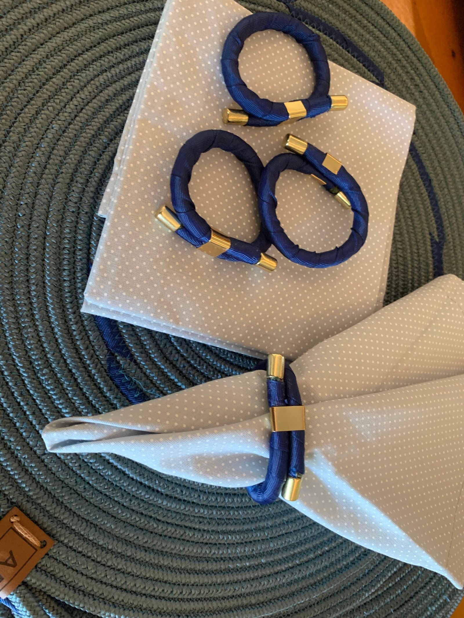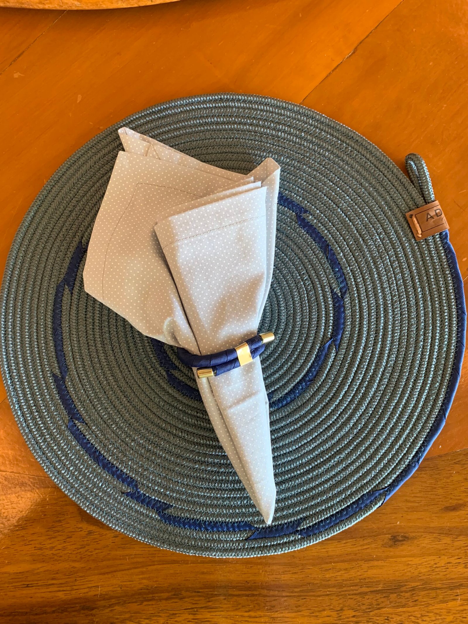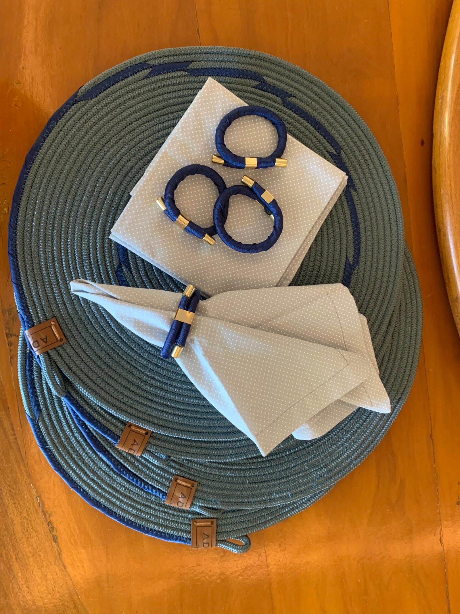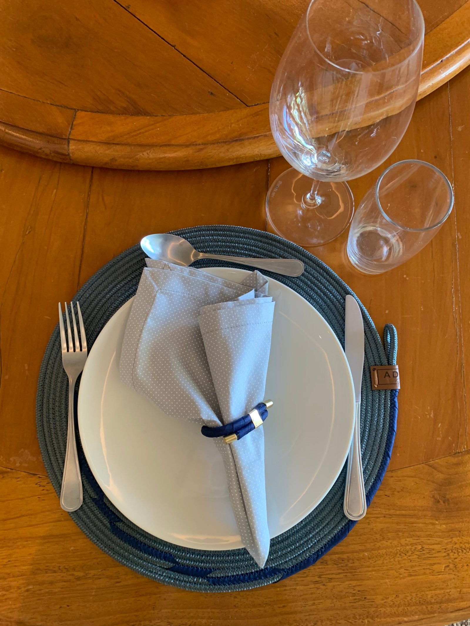Jogo completo, quatro lugares de mesa com guardanapo e porta guardanapo.