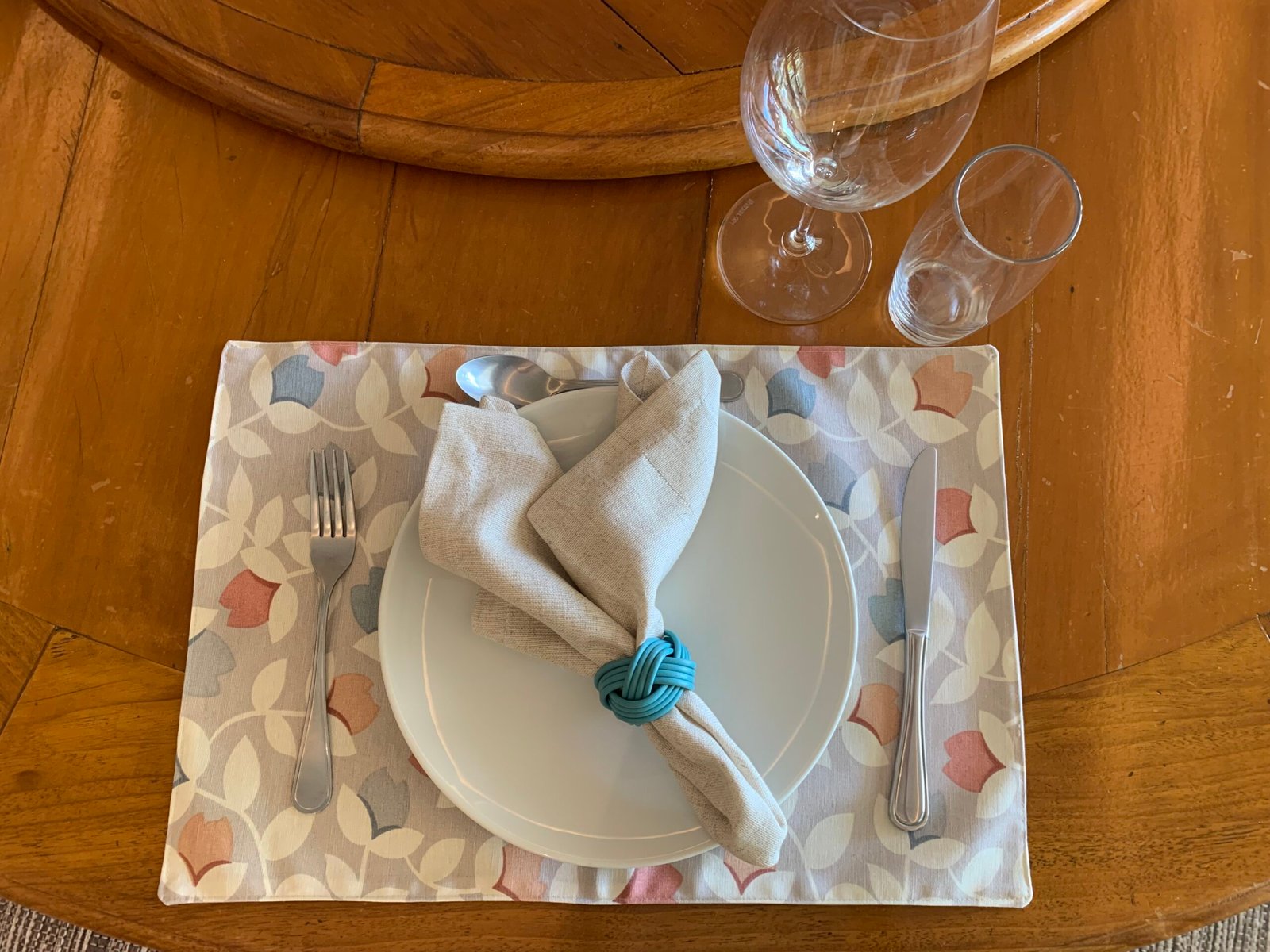 Jogo completo, quatro lugares de mesa com guardanapo e porta guardanapo.